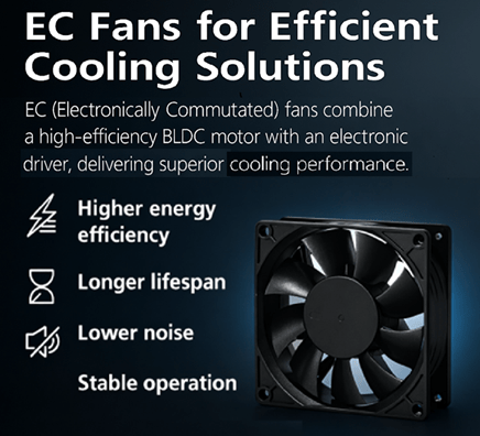 - This makes EC fans ideal for long‑duration operation and for use in confined or thermally sensitive environments.
